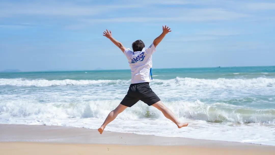 玩累了便坐在沙滩上,静听海浪拍岸的白噪音,眼前只剩下这一片蔚蓝。这大概就是屈原说的“欲远集而无所止兮,聊浮游以逍遥”吧。