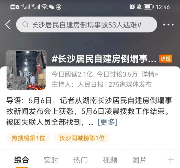 近日,央视新闻发布消息通报了长沙自建房倒塌事故的最新进展:截止5月6日3时03分,现场搜救工作结束,事故现场被困、失联人员已全部找到,共获救10人,遇难53人。